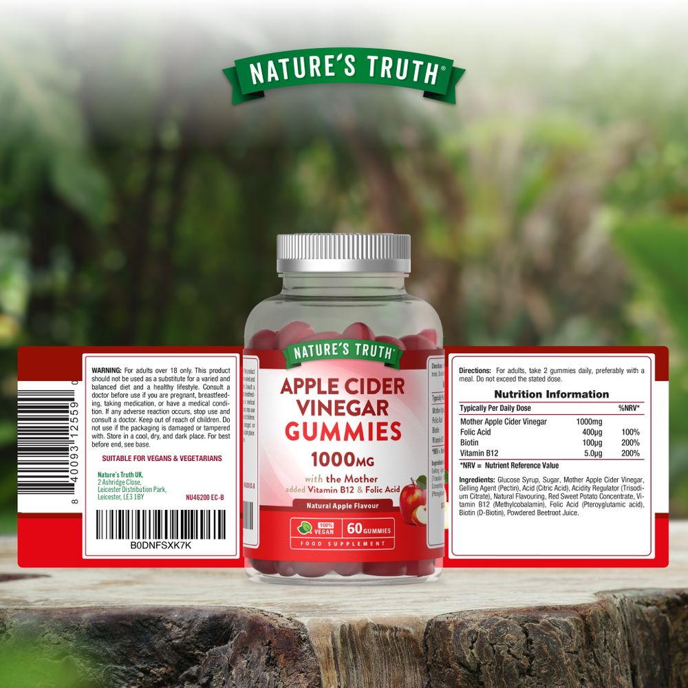 Nature's Truth Apple Cider Vinegar Gummies with "the Mother" and Ginger provide a convenient, tasty way to enjoy the benefits of apple cider vinegar without the strong taste. These apple-flavoured vegan gummies combine raw, unfiltered apple cider vinegar with ginger extract to support digestion, detoxification, and overall wellness.