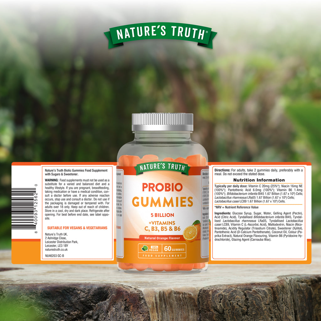Nature's Truth Multi-Biotic Gummies combine three live probiotic strains with essential vitamins C, B3, B5, and B6, providing a delicious pineapple-flavoured way to support digestive and immune health. These vegan gummies are specially formulated to promote gut balance and enhance overall wellness.