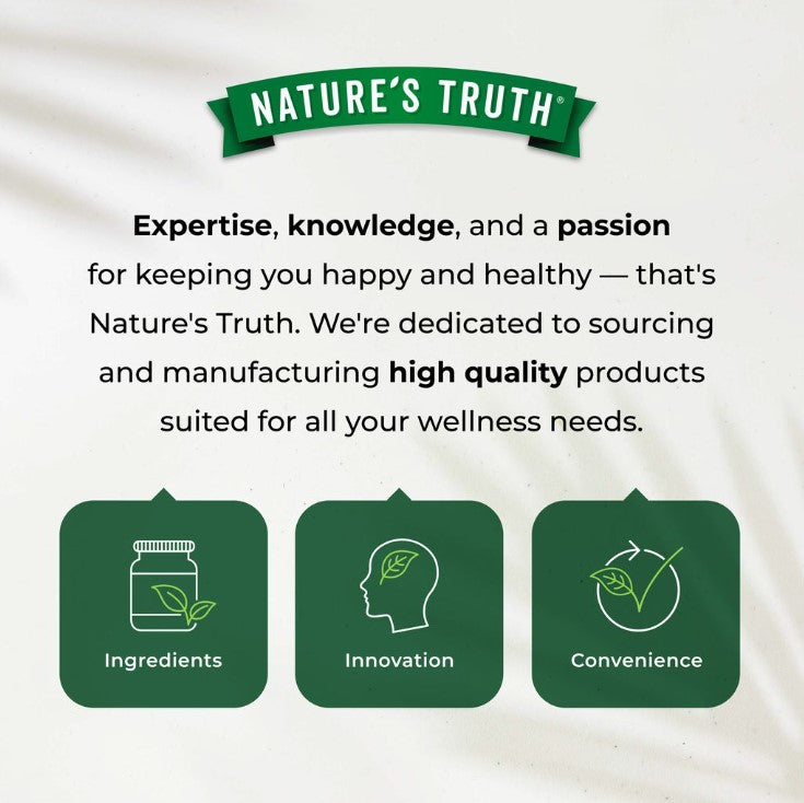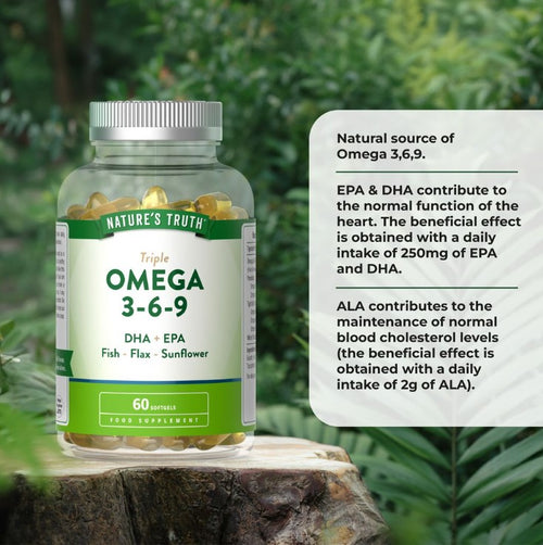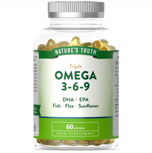 Nature's Truth Triple Omega 3-6-9 softgels provide a high-strength blend of essential fatty acids, combining omega-3, omega-6, and omega-9 oils from fish, flaxseed, and sunflower. These fatty acids play a vital role in supporting heart, brain, and overall cellular health, making this supplement ideal for those looking to support their wellness naturally.